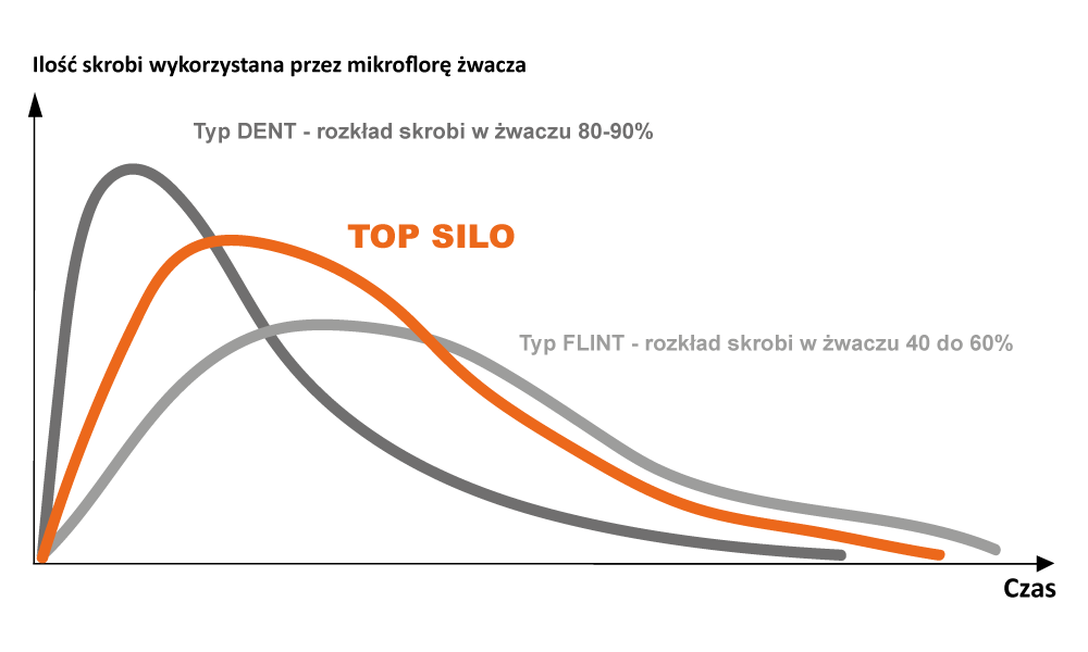 Top Silo jest więc celowym połączeniem dwóch mieszańców kukurydzy o zbliżonej wczesności. Dobór odmian zakłada połączenie uzupełniających się wzajemnie typów skrobi, w celu produkcji najwyższej jakości kiszonki i jej maksymalnym wykorzystaniu. Dzięki TOP SILO uzyskujemy stałe, a co najważniejsze, równomierne uwalnianie energii ze skrobi w przewodzie pokarmowym przeżuwaczy. Mieszanina najlepszych odmian na kiszonkę Top Silo polepsza wykorzystanie skrobi dzięki połączeniu dwóch jej rodzajów dzięki czemu można uzyskać lepszą zdrowotność stada, redukcję kwasicy, unormowane pH, a przez to zwiększyć produkcję mleka bogatego w tłuszcz i proteiny, dzięki stałemu uwalnianiu się energii w żwaczu z dwóch rodzajów skrobi: mączystej i szklistej. Wzrost mleczności nie odbywa się przy tym kosztem zdrowotności krów lecz powodowany jest wyłącznie wykorzystaniem całej dostępnej energii, redukcją kwasicy i utrzymywaniem właściwego pH żwacza. Przekłada się to z kolei na wymierne korzyści finansowe.