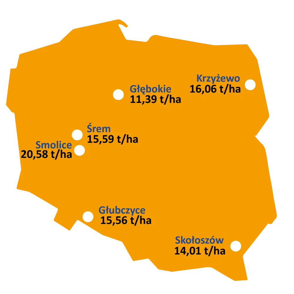 👉 Najwyższy plon w stacji: 18,74 t/ha na sucho – Smolice (20,58 t/ha na mokro przy 21,7% wilgotności)