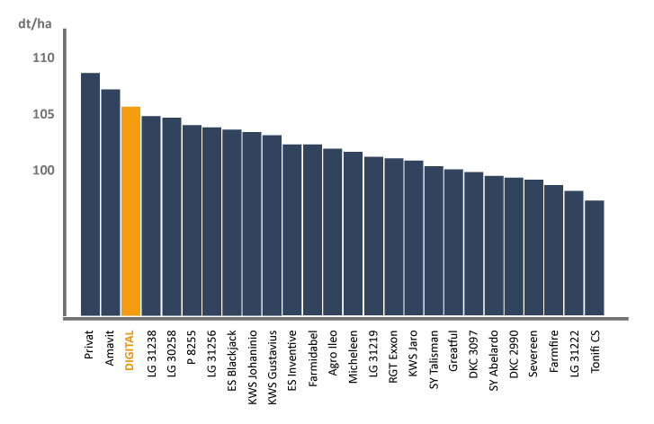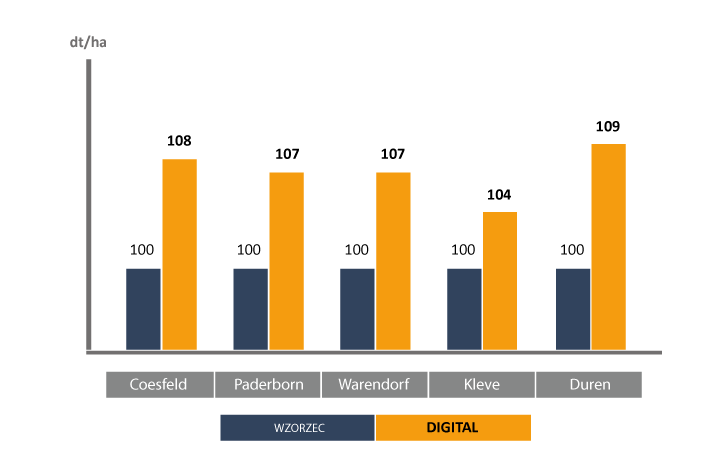 Średni wynik doświadczeń w każdej z 5 różnych lokalizacji, pokazał znaczną przewagę odmiany Digital nad najlepszymi odmianami wzorcowymi i bardzo dużą stabilność plonowania.