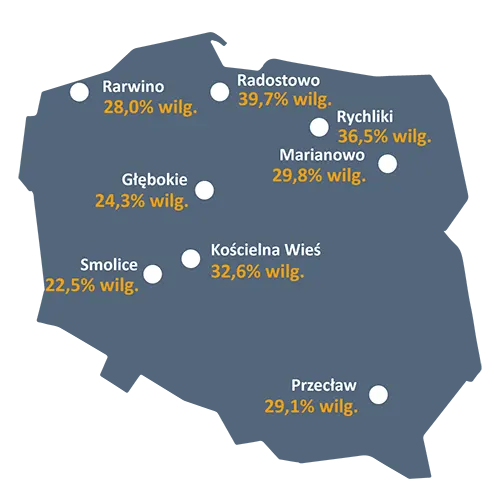 Kukurydza na ziarno. Odmiany wczesne. Doświadczenia rozpoznawcze COBORU/PZPK 2022. Wilgotność ziarna podczas zbioru (%)