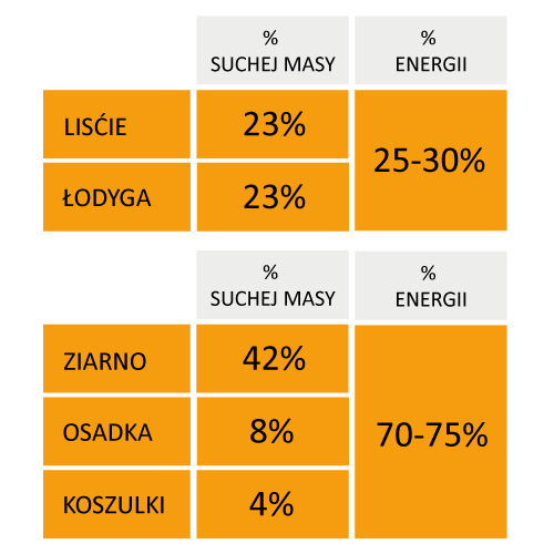 Mówiąc o energii mamy na myśli energię uwalnianą z ziarna podczas rozkładu w przewodzie pokarmowym. Aż 70-75% energii pochodzi właśnie z kolb, a w zasadzie z ziarna. W ostatnich latach coraz częściej zwraca się uwagę również na typ ziarna. Dzieje się tak ponieważ zupełnie inaczej trawione jest ziarno typu „dent”, a zupełnie inaczej typ „flint”. Wynika to ze specyficznej budowy ziarniaków obu typów odmian.
